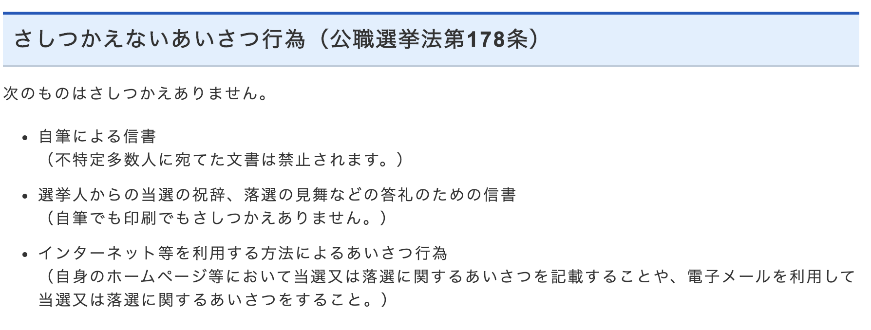 特に厳しいのは「文書図面を頒布したり、掲示すること」という制限で、これがあることにより、「選挙中さんざん葉書を送りつけてきたのに、選挙後はなにも言ってこない」とお叱りを受けることになる一因となります。涙